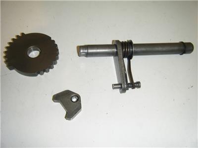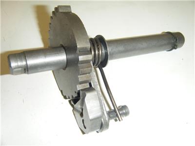 This is a transmission gear shifting shaft/gear mechanism off of a vintage AHRMA 1979 Husqvarna WR 250 moto-cross dirt bike. It is in good condition and it includes the gear, spring, and ratchet mechanism. S373-49