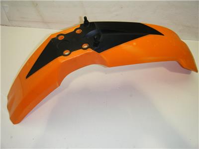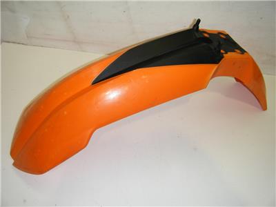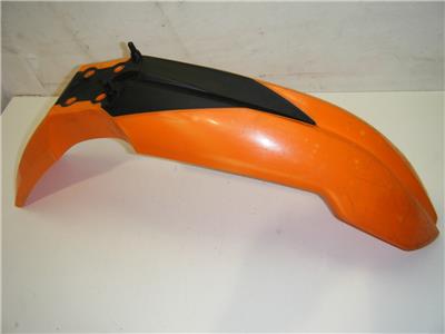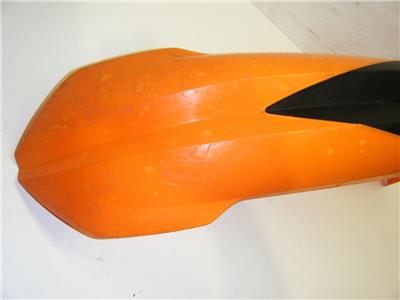 THIS IS AN ORANGE PLASTIC FRONT FENDER OFF OF A KTM MOTORCYCLE. THE NUMBER ON THE BOTTOM IS KTM 773.08.010.000. WE GOT THIS ALREADY OFF OF THE MOTORCYCLE AND I AM NOT SURE EXACTLY WHAT YEARS OR MODELS IT WILL WORK ON. IT IS IN GOOD CONDITION OVERALL WITH NO CRACKS OR BREAKS. IT HAS SOME LIGHT SCRATCHES ON THE FRONT AND SOME SMALL DISCOLORED SPOTS, BUT OTHER THAN THAT IT LOOKS GOOD. SMP156-09