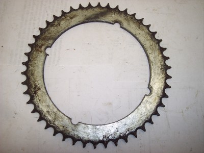THIS IS A REAR WHEEL CHAIN SPROCKET OFF OF AN OLDER ASIAN MOTORCYCLE, BUT I AM NOT SURE EXACTLY WHAT YEAR OR MODEL IT IS IN GOOD USABLE CONDITION. IT IS ABOUT 7 5/8″ O.D. AND 5 1/4″ I.D.. SMP108-26